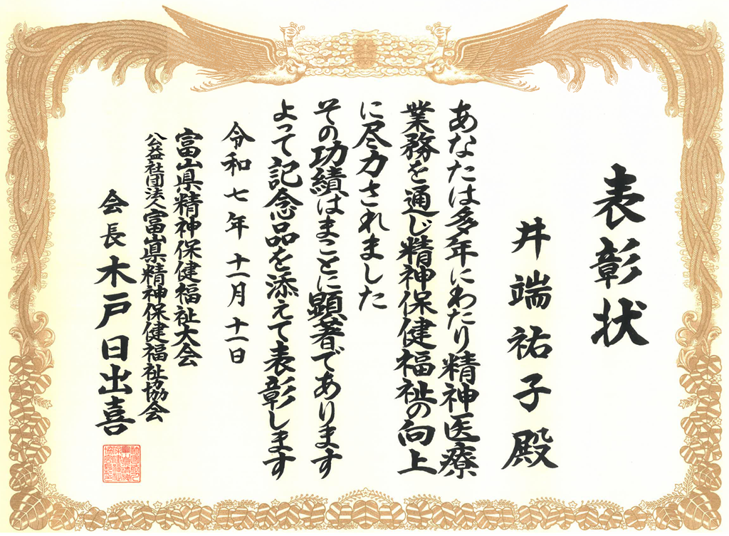 このたび、富山県および富山県精神保健福祉協会主催の「令和7年度富山県精神保健福祉大会」におきまして、当クリニックの看護師である井端さんが表彰されました。